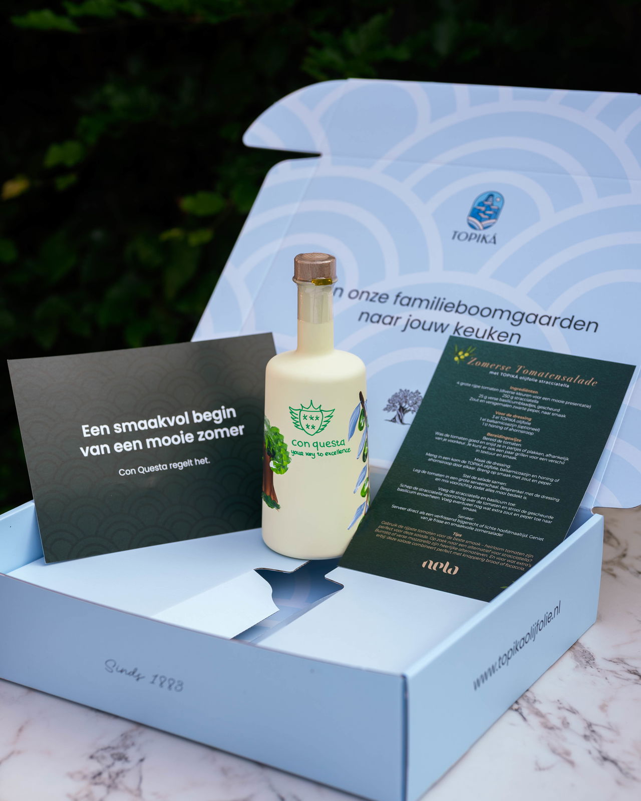 Maak indruk op uw relaties met exclusieve handbeschilderde olijfolieflessen, volledig gepersonaliseerd met uw bedrijfslogo en boodschap. Perfect voor kerst, jubilea en relatiebeheer.